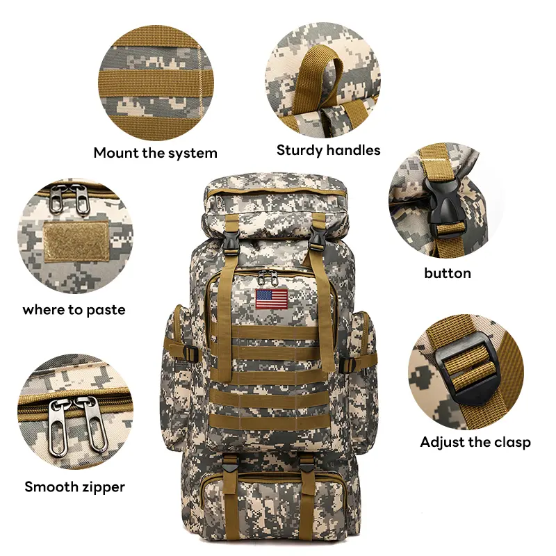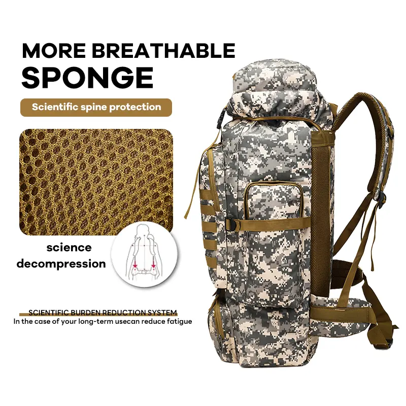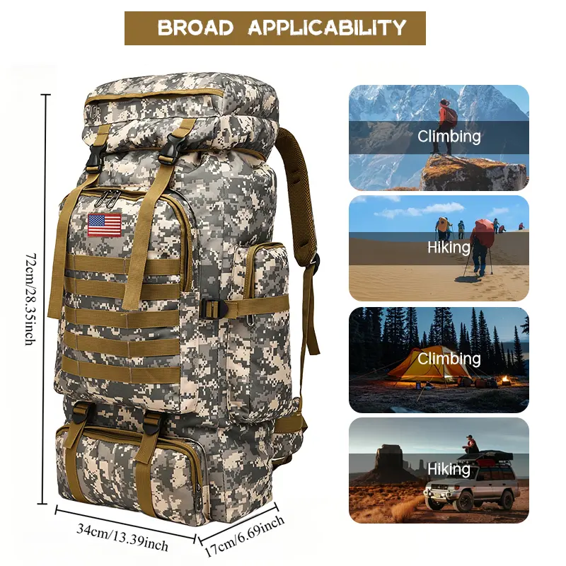 Beschreibung【Wetterfest】: Dank seines wasserdichten Designs hält dieser Rucksack Ihre Sachen bei Outdoor-Abenteuern und schlechtem Wetter trocken.【Tarnmuster】: Mit seinem markanten Tarnmuster ist dieser Rucksack nicht nur funktional, sondern verleiht Ihrer Outdoor-Ausrüstung auch einen stylischen Touch.【Sicherer Verschluss】: Der Rucksack ist mit Schnürverschlüssen ausgestattet, die einen sicheren Verschluss gewährleisten und Ihre Sachen unterwegs schützen.【Geräumig】: Mit einem großzügigen Fassungsvermögen von 75 Litern bietet er ausreichend Platz für alles Wichtige und ist somit perfekt für Camping, Wandern und längere Reisen.【Sportliche Ausrüstung】: Dieser Rucksack wurde mit einem sportlichen Design entworfen und ist ideal für aktive Menschen, die zuverlässige Ausrüstung für ihre Outdoor-Aktivitäten suchen.